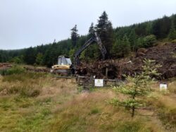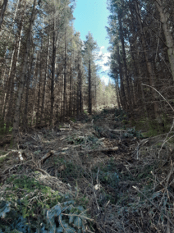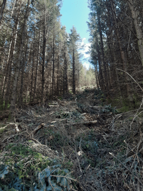 Once I leave the stacking area, the assessment of the overall site and the workings starts. There are several areas to focus on while on site. They are damage to the site, such as the presence of litter or waste, ensuring that the felling practices and health and safety on site are being adhered to. and checking any damage to retained trees on the ground, or to the forest road. If any of these are identified, then I will speak to the contractor and discuss my findings and how they might have evolved. Once the cause is identified then mitigations will be put in place and correctional actions implemented.Â