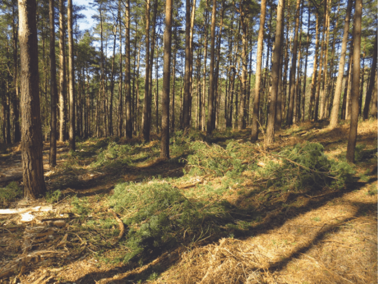 The only remaining part of the tree was the fine and branchy matter known as brash. This is left in the woodland to form rough tracks to support the machinery on soft ground where necessary. It soon degrades back into the soil fertilising the remaining trees.