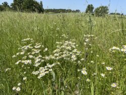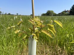 The main broadleaf trees planted are native species such as hornbeam for their longevity and benefits to wildlife. Hornbeam which can live for over 300 years, produces fruits and provides shelter for birds. Pedunculate Oak was planted across the site as native species for biodiversity as its flowers, leaves and fruits supports hundreds of insects, invertebrates, and birds as their main food source. Throughout the Autumn many mammals feed on their acorns, whilst the bark can provide roosting spots for bats. Wild cherry is a British tree chosen for the beautiful blossom it produces providing pollen and nectar for bees alongside an abundance of fruit for birds and people. White willow provides the added benefits of being a natural medicine to relieve pain for not only humans but for certain animals also.