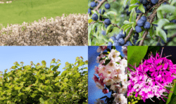 Hedging species: Clockwise from top left: Hawthorn, Blackthorn, Hazel, Crab Apple and Wild Privet.