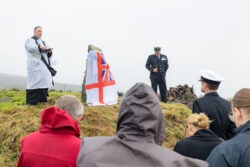 The event marked the unveiling of a newly erected standing stone and brass plaque, dedicated to the memory of Sub Lieutenants William Seddon Appleby, Ernest Hartley Green, and Joe Lupton of the Royal Navy’s Fleet Air Arm. The three men were all members of 848 Naval Air Squadron and died on 3rd February 1944 when their aircraft, a Grumman Avenger FN 821, crashed in poor weather while enroute from Gosport to Kirkwall.