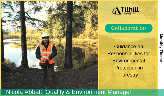 Nicola Abbatt is Tilhill Forestry’s Quality & Environmental Manager. She is working in collaboration with members of the Forest Industry Environment Group in order to produce an industry level Guidance on Responsibilities for Environmental Protection in Forestry. The latest draft of this can be found (here):