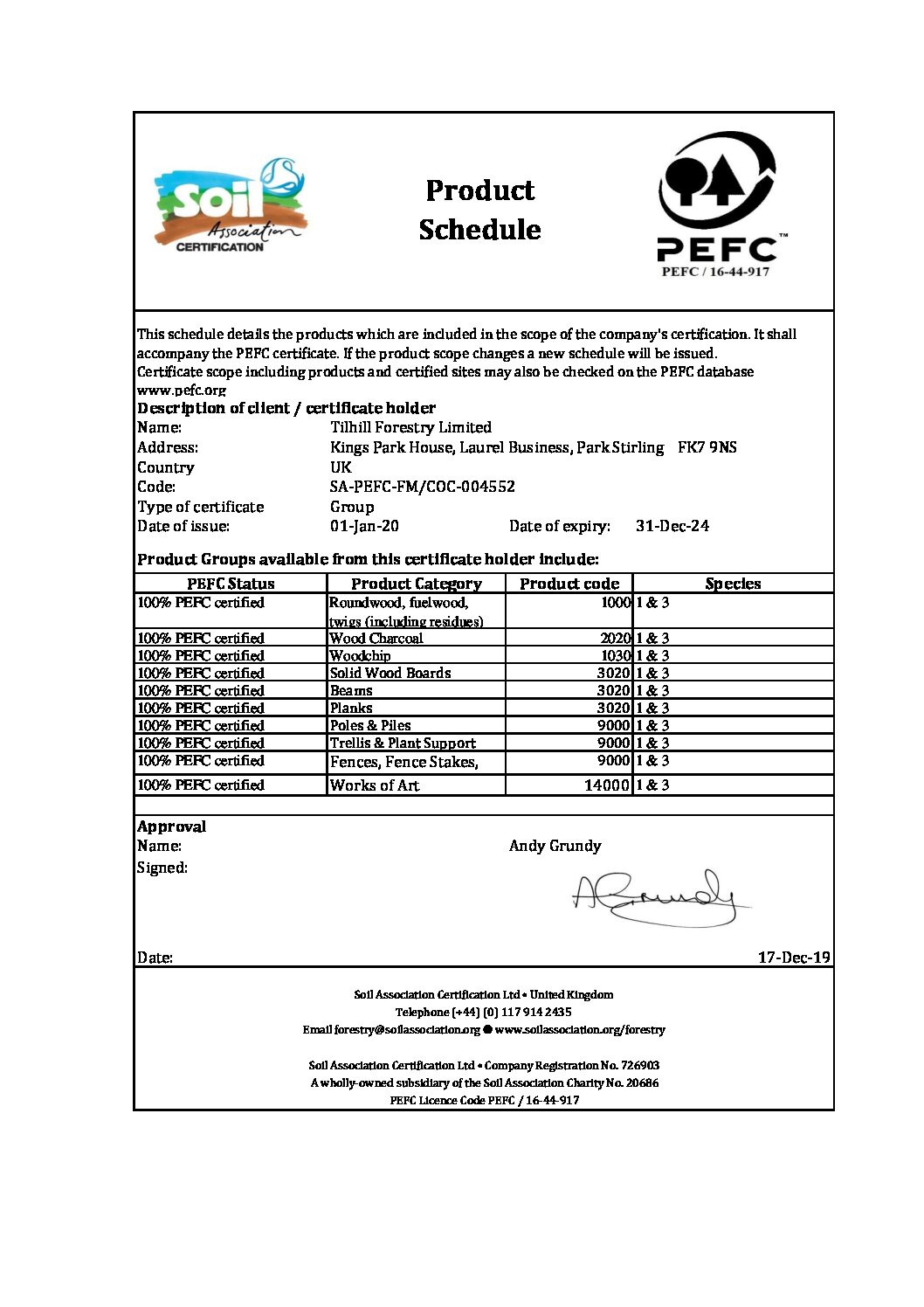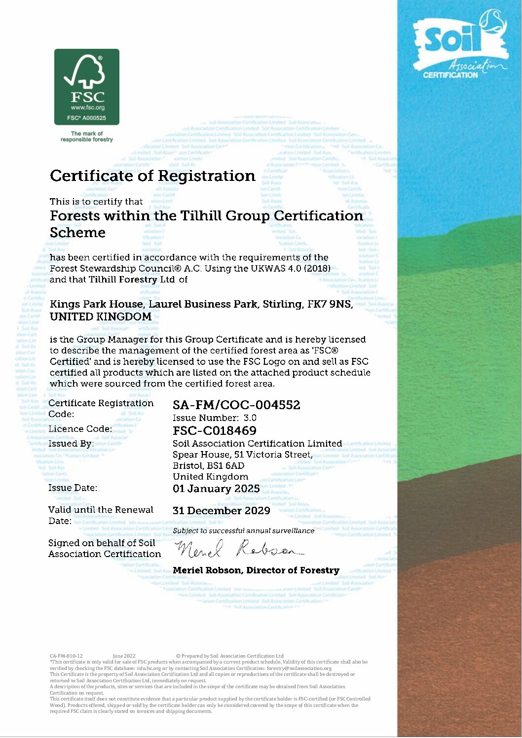 A certified Chain of Custody (CoC) tracks certified material through the production process – from the forest to the consumer, including all successive stages of processing, transformation, manufacturing and distribution. Tilhill holds both FSC® and PEFC Chain of Custody Certificates. You can download a copy of these here: