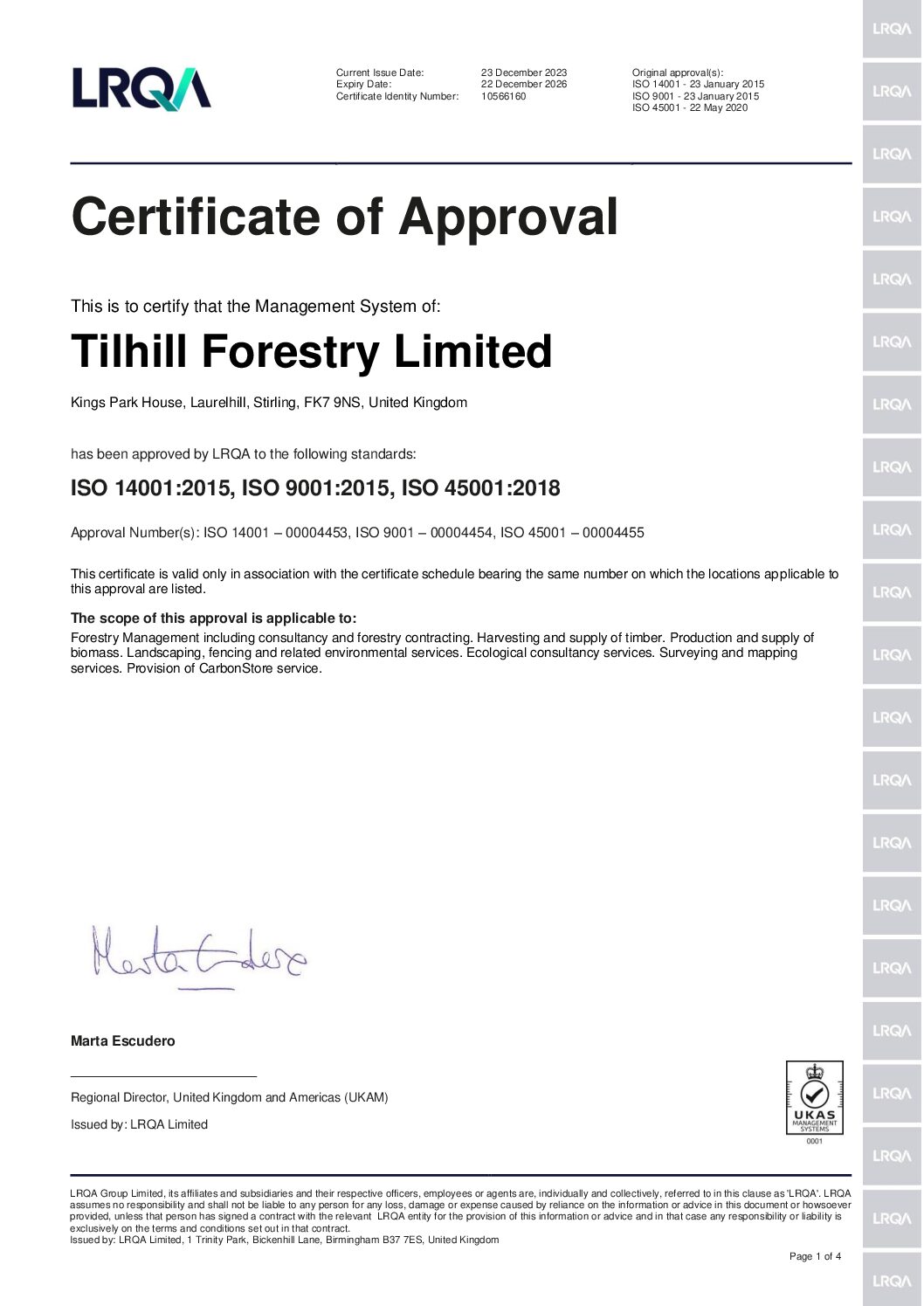 The internationally recognised standard for quality. Certification reassures our customers that Tilhill Forestry Ltd is fully committed to quality by continuously undergoing the scrutiny, by audit, of an accredited external body.