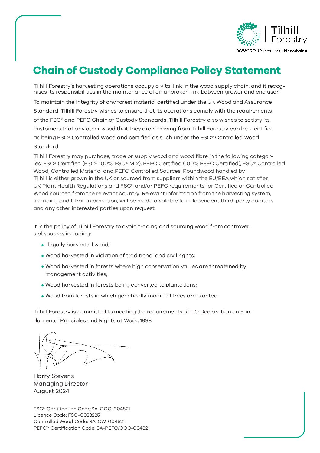 If you have any queries or complaints regarding Tilhill’s Chain of Custody certification please contact our Certification & Assurance Manager Julian Hollingdale (julian.hollingdale@tilhill.com)